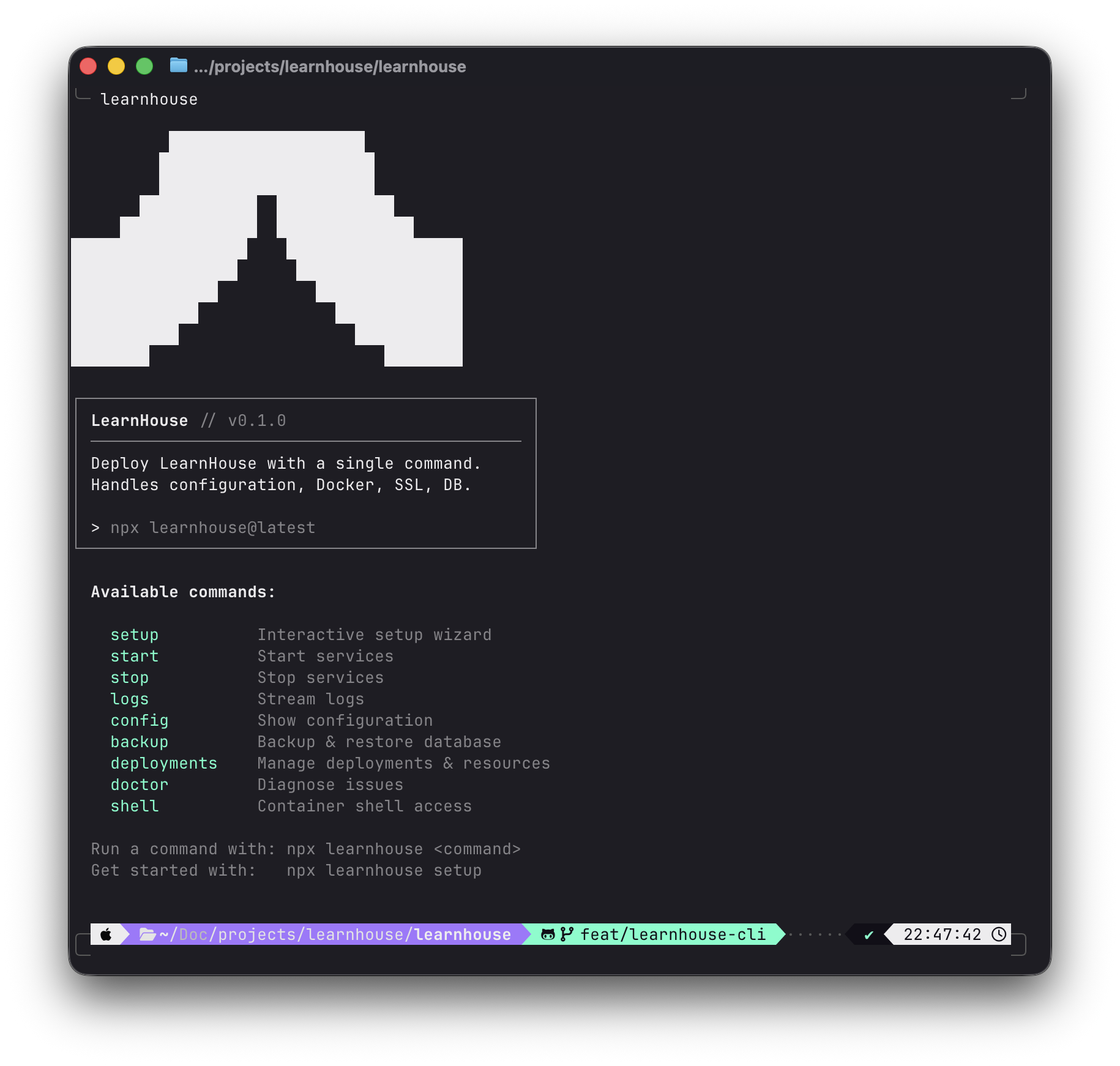The LearnHouse CLI is the primary tool for deploying, managing, and developing LearnHouse. It orchestrates Docker Compose services and provides an interactive setup wizard for production deployments, as well as a full local development environment.